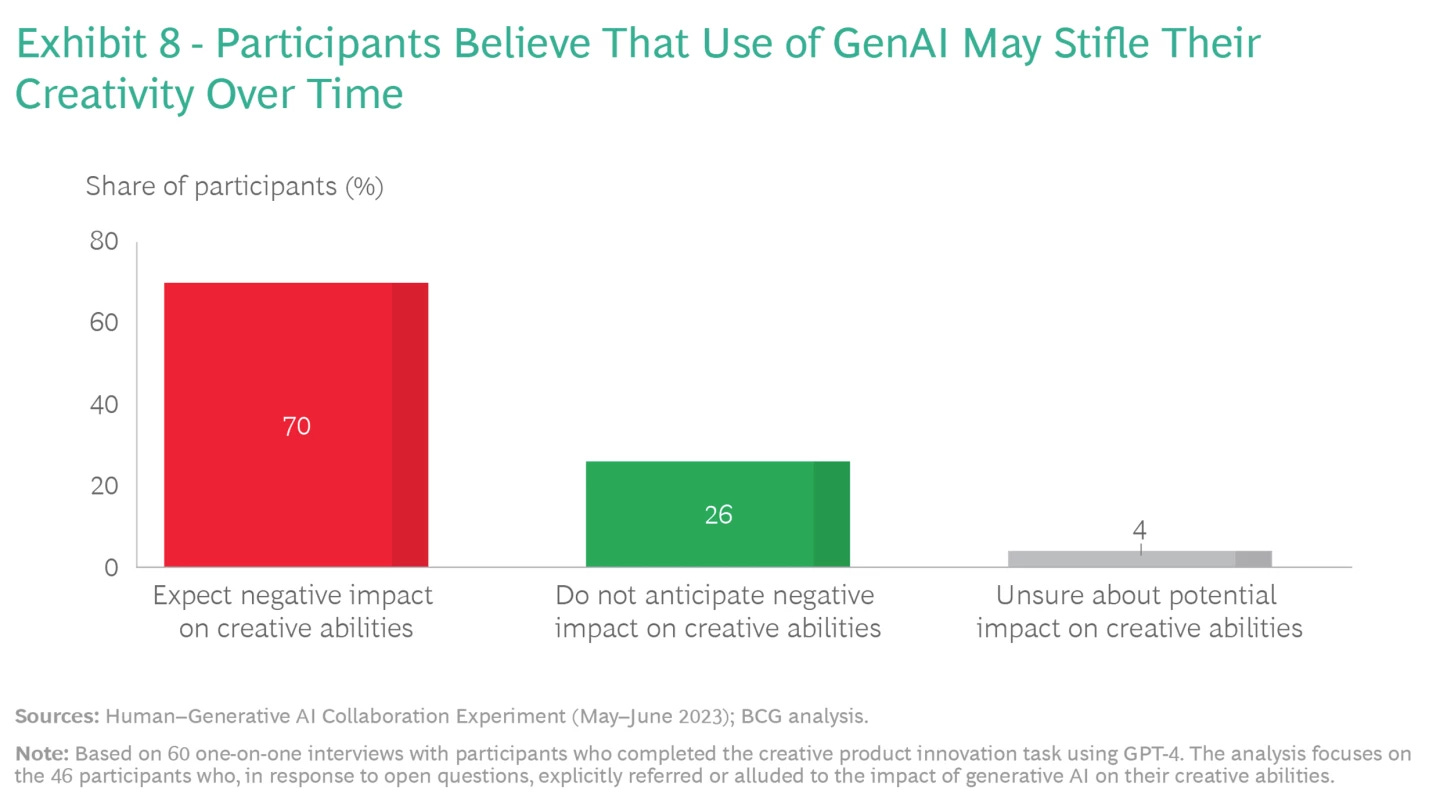 Researchers found that for tasks that ChatGPT is currently good at (e.g. creative ideation), users who leveraged ChatGPT reported feeling their creative abilities atrophy while using it.