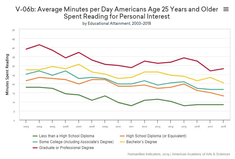 While it is a difficult to get a specific graph that shows aggregate drops in time spent researching and pursuing knowledge, a useful proxy for this is the drop in time spent reading for personal interest seen between 2003-2018 by the American Academy of Arts and Sciences:
